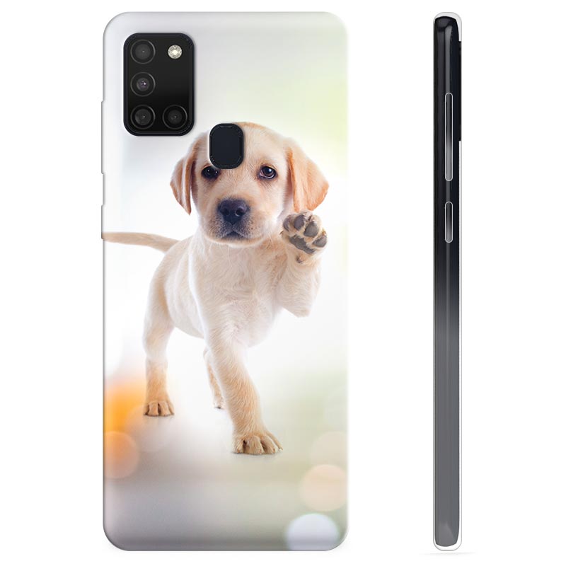 Dette er et TPU-deksel for Samsung Galaxy A21s som er designet for å gi beskyttelse til telefonen din samtidig som det legger til et personlig og sjarmerende preg. Dekselet har et bilde av en søt, lyshåret hundevalp som ser rett mot deg. Valpens øyne og utstrakte pote mot kameraet skaper en søt og engasjerende effekt. Dekselet selv er laget av fleksibelt TPU-materiale som er slitesterkt og støtabsorberende, bidrar til å beskytte telefonen mot hverdagslige støt, riper og støv. Designet tillater enkel tilgang til alle telefonens porter og funksjoner uten å fjerne dekselet. Transparente sider beholder telefonens originale design synlig, mens bakstykket med valpemotivet gir et unikt utseende.