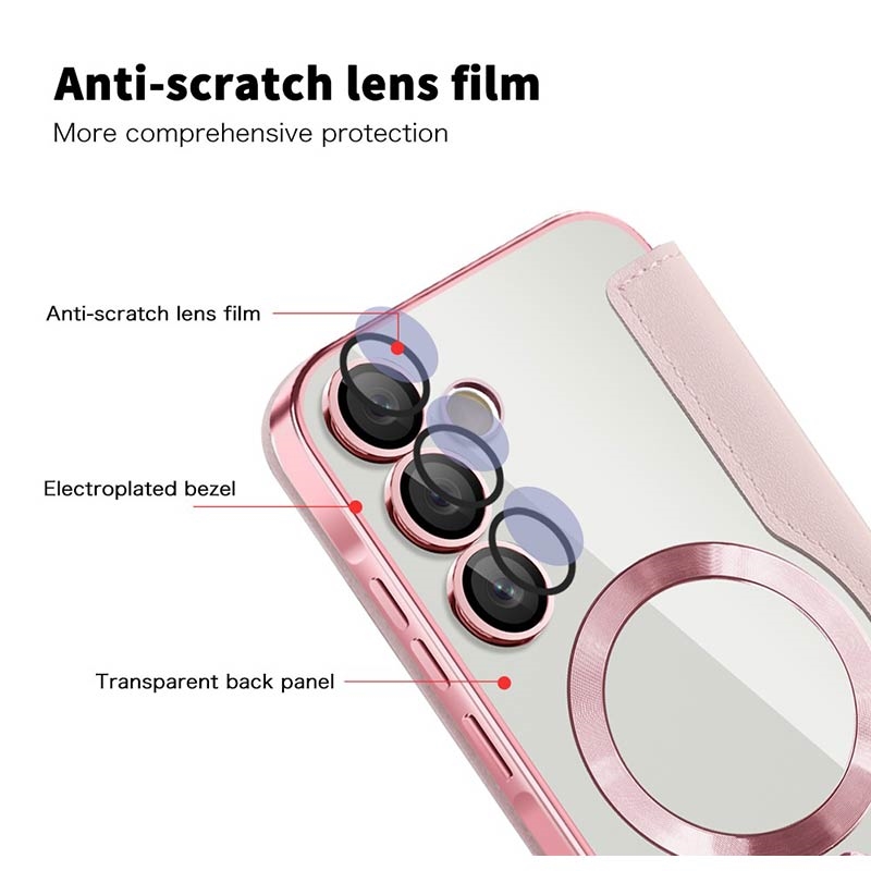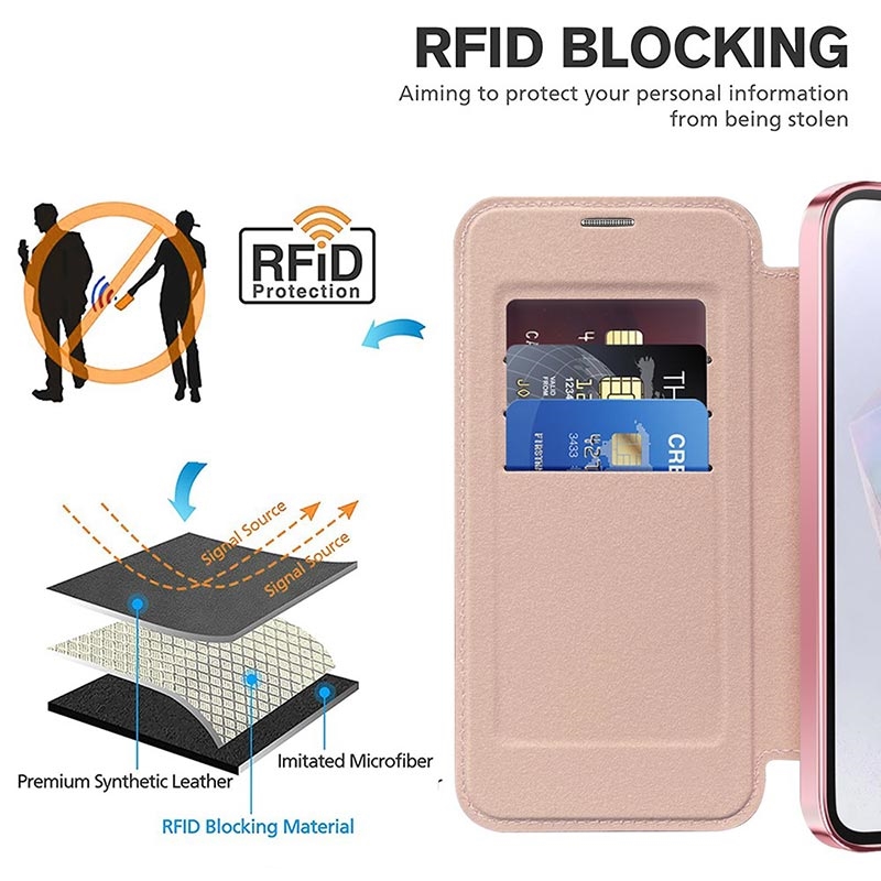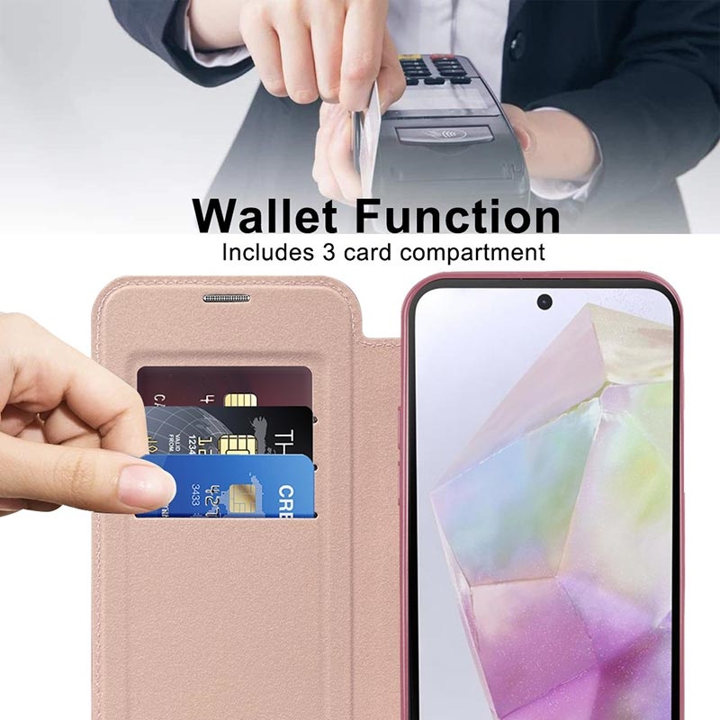 Dette førsteklasses Samsung Galaxy A35-etuiet er laget av TPU, akryl og polyuretan av høy kvalitet i en fin prosess for å sikre en delikat og utsøkt finish. Det er utstyrt med et praktisk kortspor som gjør det enkelt å dra kort og bruke dem når du er på farten, og har en sterk magnet for automatisk lukking, noe som gjør det trygt og praktisk å oppbevare ting på innsiden. Dette Samsung Galaxy A35-etuiet gir effektiv beskyttelse mot daglig slitasje, riper, merker og skrammer, mens den avanserte RFID-blokkeringsteknologien i kortsporet sikrer at dine personlige opplysninger er beskyttet mot tyveri. I tillegg er den innebygde magnetringen kompatibel med MagSafe trådløs lading, slik at du kan lade Samsung Galaxy A35 uten å ta av deg etuiet.