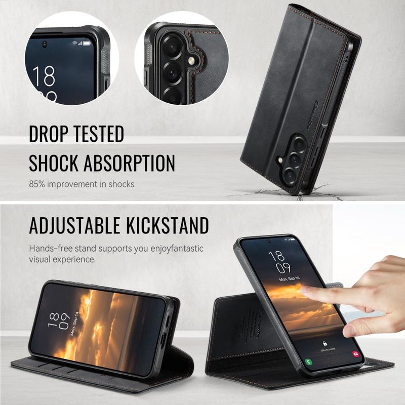 CaseMe C49 Wallet Case for Samsung Galaxy A57 er laget av slitesterk TPU og polyuretan, og gir et komfortabelt grep og pålitelig beskyttelse mot støt, fall og riper i hverdagen. På innsiden sørger et mykt mikrofiberfôr for at enheten holder seg ren.