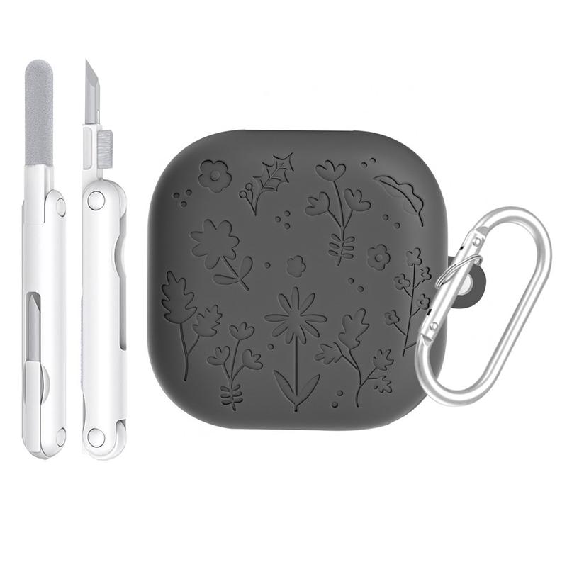 Blomstermønstret silikonetui med rengjøringspenner og karabinkrok til Samsung Galaxy Buds4, Galaxy Buds4 Pro