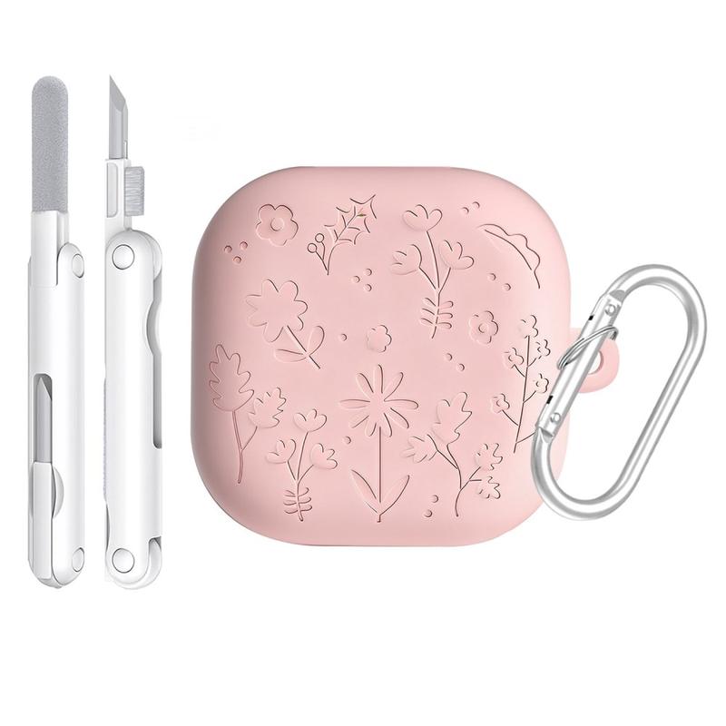 Blomstermønstret silikonetui med rengjøringspenner og karabinkrok til Samsung Galaxy Buds4, Galaxy Buds4 Pro