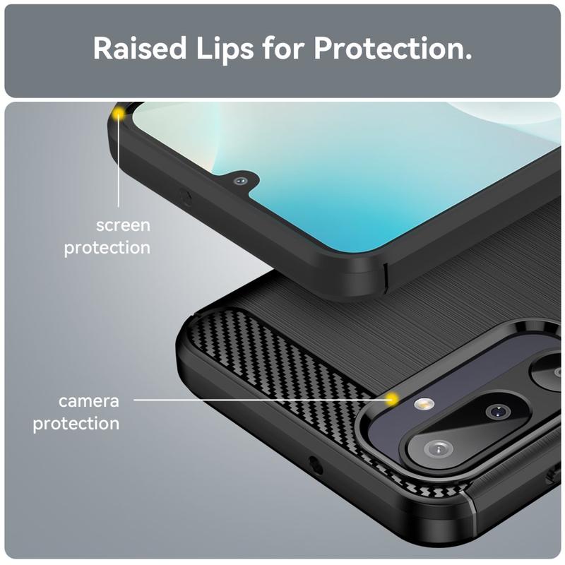 Gi din Samsung Galaxy M16, Galaxy F36 den stilige beskyttelsen den fortjener med dette børstede dekselet med karbonfiberstruktur. Det kombinerer en elegant, børstet overflate med en robust, beskyttende design, og beskytter enheten din mot daglige støt og riper samtidig som det gir et komfortabelt grep.