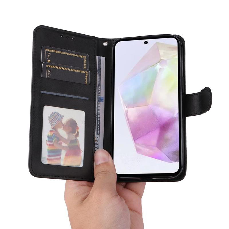 Øk beskyttelsen av din Samsung Galaxy M35 med Wallet Case Magnetic Closure. Dette etuiet er laget av førsteklasses polyuretan og føles mykt å ta på, samtidig som det gir holdbar beskyttelse for din Samsung Galaxy M35. Den diskrete elegansen i polyuretan med litchi-tekstur og fine sømmer gir en luksuriøs finish til din Samsung Galaxy M35.