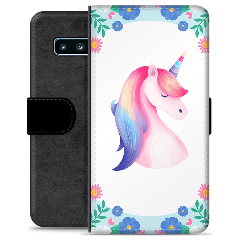 Dette vakre lommebok-dekselet med et flerfarget enhjørningsmotiv er designet spesielt for Samsung Galaxy S10. Dets iøynefallende design viser en sjarmerende enhjørning omringet av delikate blomsterdetaljer, perfekt for dem som ønsker å legge en personlig og magisk touch til sin smarttelefon. Lommebok-dekselet er laget av høykvalitets materialer som gir robust beskyttelse mot riper og støt, samtidig som det opprettholder en slank og stilig profil.