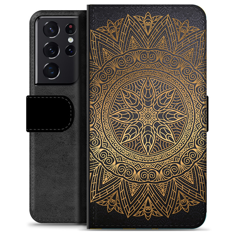 Samsung Galaxy S21 Ultra 5G premium lommebok-deksel med mandalamønster er det ultimate tilbehøret for å gi enheten din et unikt utseende samtidig som det tilbyr funksjonell beskyttelse. Dette stilig utformede dekselet har et øye-fangende mandalamotiv i gull på en svart bakgrunn, noe som tilfører et preg av eleganse og spiritualitet til din smartphone.