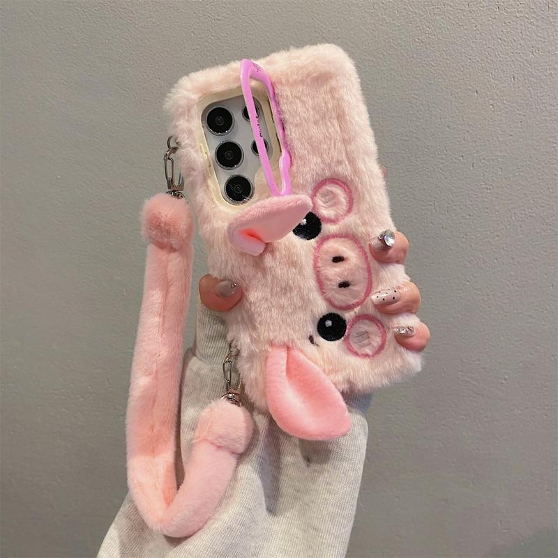 Plysj smågrise-deksel med støtte og håndstropp til Samsung Galaxy S24 Ultra