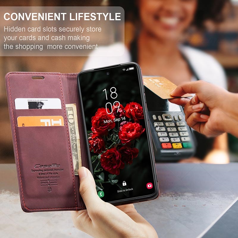 Bær dine viktige kort og kontanter sammen med din Samsung Galaxy S24 FE takket være dette Caseme 013-serien lommebok-deksel!