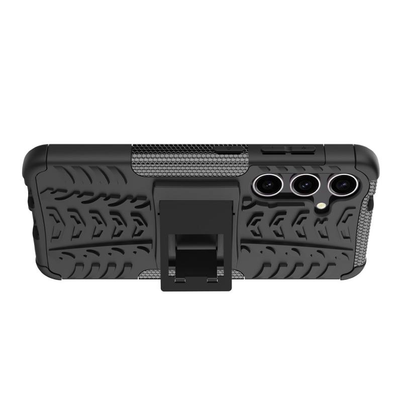 Det harde ytre skall gjør Samsung Galaxy S24+ mindre utsatt for bøying, mens det støtdempende indre deksel beskytter den mot dråper og støt. I tillegg har det også et integrert stativ for komfortabel videovisning på Samsung Galaxy S24+.