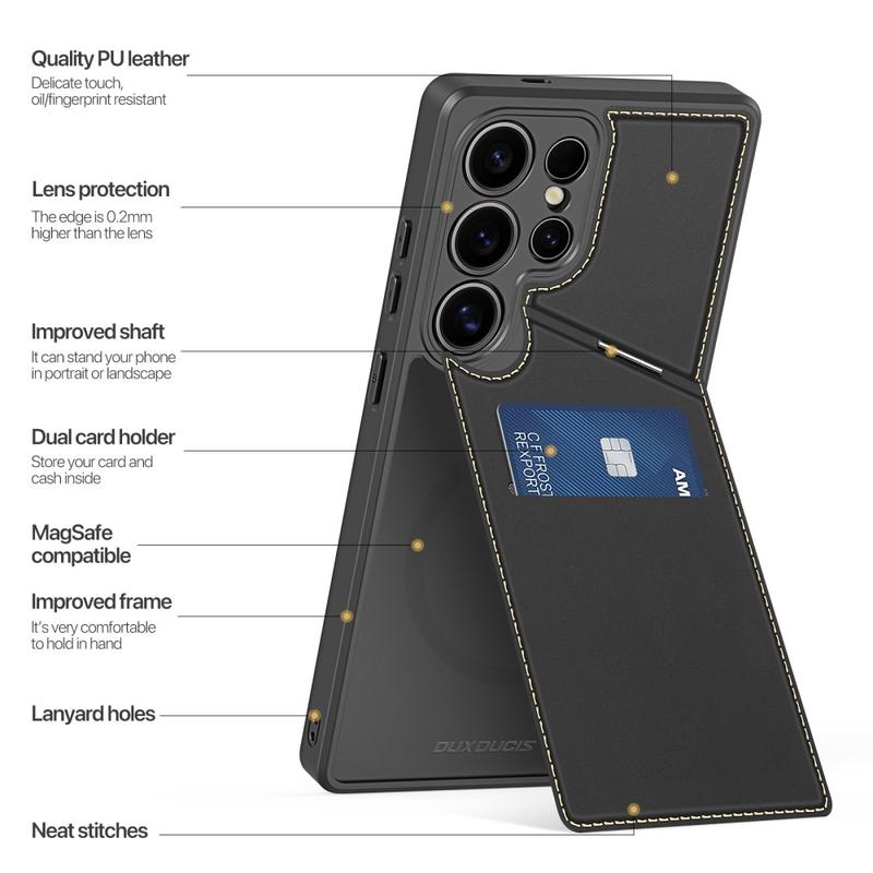 Hold din Samsung Galaxy S25 Ultra trygg og stilig med Dux Ducis Rafi II Series Magnetic Case. Dette førsteklasses etuiet kombinerer en elegant skinnfinish med et slitesterkt TPU-interiør for omfattende beskyttelse. Det er designet for funksjonalitet, og har innebygd støtteben, magnetisk lukking og kortspor, noe som gjør det ideelt for brukere som trenger både bekvemmelighet og eleganse.