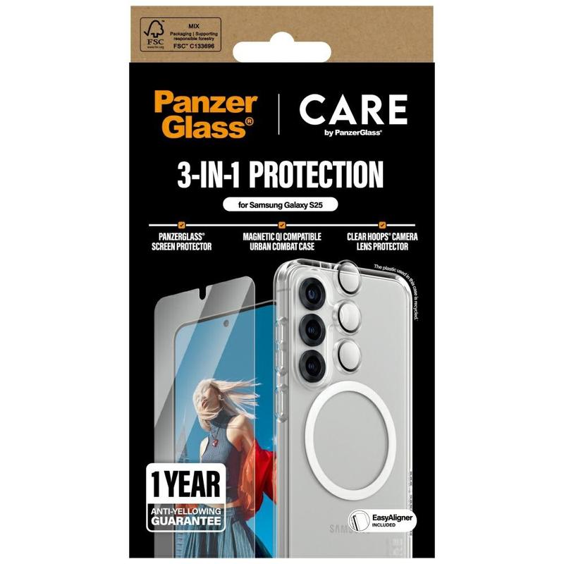 Care by PanzerGlass Flagship 3-i-1-beskyttelsespakke for Samsung Galaxy S25 - MagSafe Urban Combat-etui, skjermbeskytter i herdet glass med ultrabred passform og Hoops kameralinsebeskytter