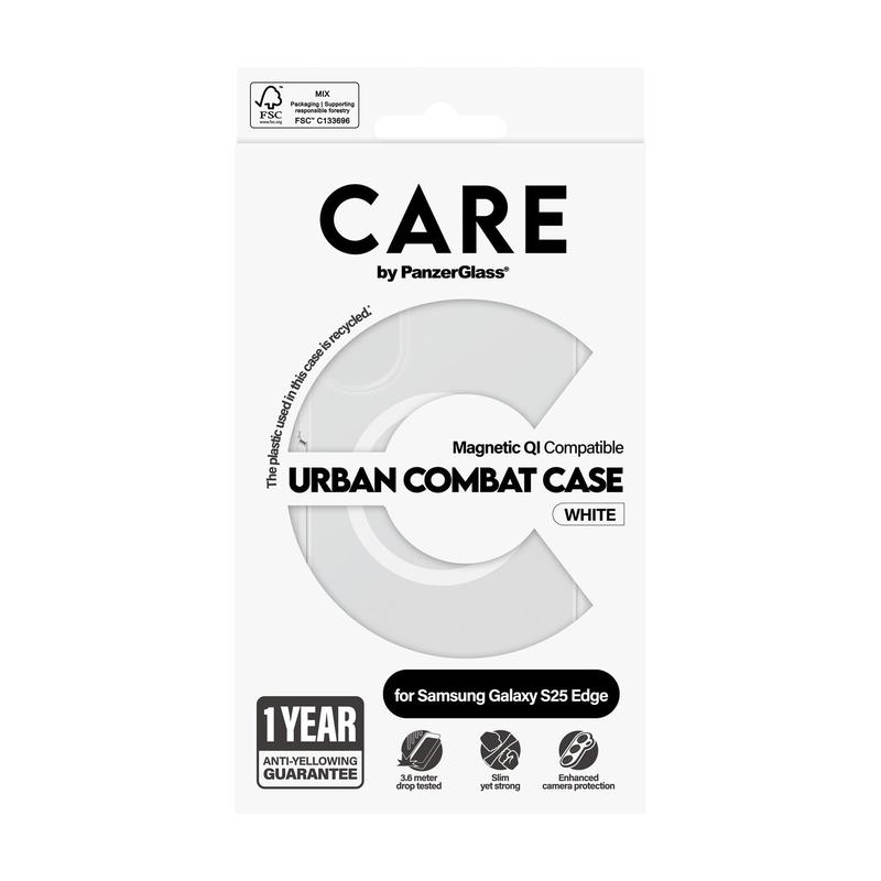 CARE by PanzerGlass Urban Combat Case er perfekt for deg som er ute etter et stilig, miljøvennlig og svært beskyttende etui til Samsung Galaxy S25 Edge. Beskyttelsen på militærnivå, MagSafe-kompatibiliteten og de bærekraftige materialene gjør det til et utmerket valg for alle brukere.