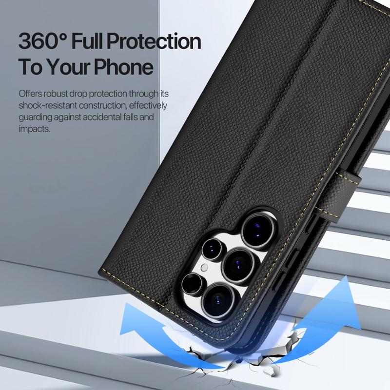 Oppgrader din Samsung Galaxy S25 Ultra med Dux Ducis Lawa Series Magnetic Case, et førsteklasses tilbehør som kombinerer stil og funksjonalitet. Dette svarte etuiet er laget av ekte okseskinn og har en avtakbar lommebok med glidelås, slik at du kan oppbevare de viktigste tingene dine på en sikker måte. Den magnetiske designen gjør det enkelt å feste og løsne etuiet, noe som gir fleksibilitet for daglig bruk. Med sin elegante og slitesterke konstruksjon gir dette etuiet omfattende beskyttelse for enheten din, samtidig som det har et sofistikert utseende.