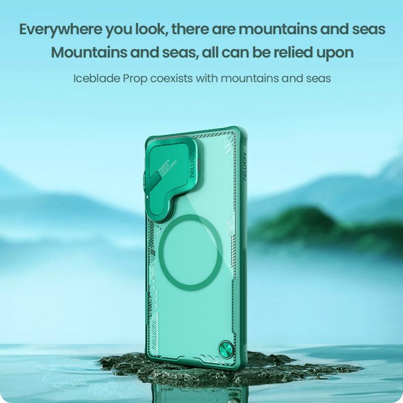 Beskytt din Samsung Galaxy S25 Ultra med Nillkin IceBlade Prop Magnetic Case. Dette elegante etuiet kombinerer holdbarhet med bekvemmelighet, og tilbyr full MagSafe-kompatibilitet. Det er laget av PC og TPU og gir robust beskyttelse, mens det skyvbare linsedekselet beskytter kameraet mot riper og støv.