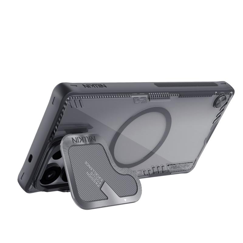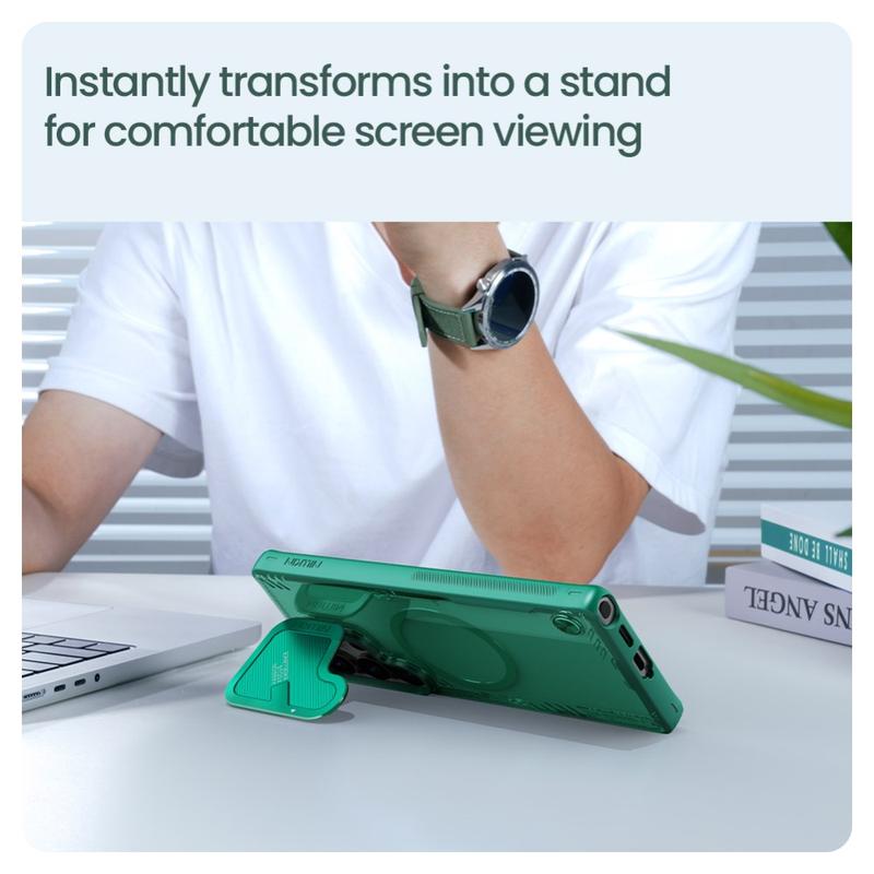 Beskytt din Samsung Galaxy S25 Ultra med Nillkin IceBlade Prop Magnetic Case. Dette elegante etuiet kombinerer holdbarhet med bekvemmelighet, og tilbyr full MagSafe-kompatibilitet. Det er laget av PC og TPU og gir robust beskyttelse, mens det skyvbare linsedekselet beskytter kameraet mot riper og støv.