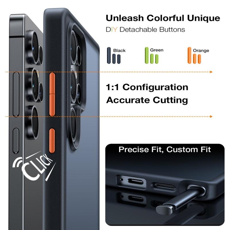Dekselet inneholder tre utskiftbare knappesett i ulike farger, slik at du kan tilpasse utseendet til din Samsung Galaxy S26 Ultra. Du kan enkelt bytte ut knappene slik at de passer til stilen, antrekket eller humøret ditt, og skape et unikt, tilpasset utseende.
