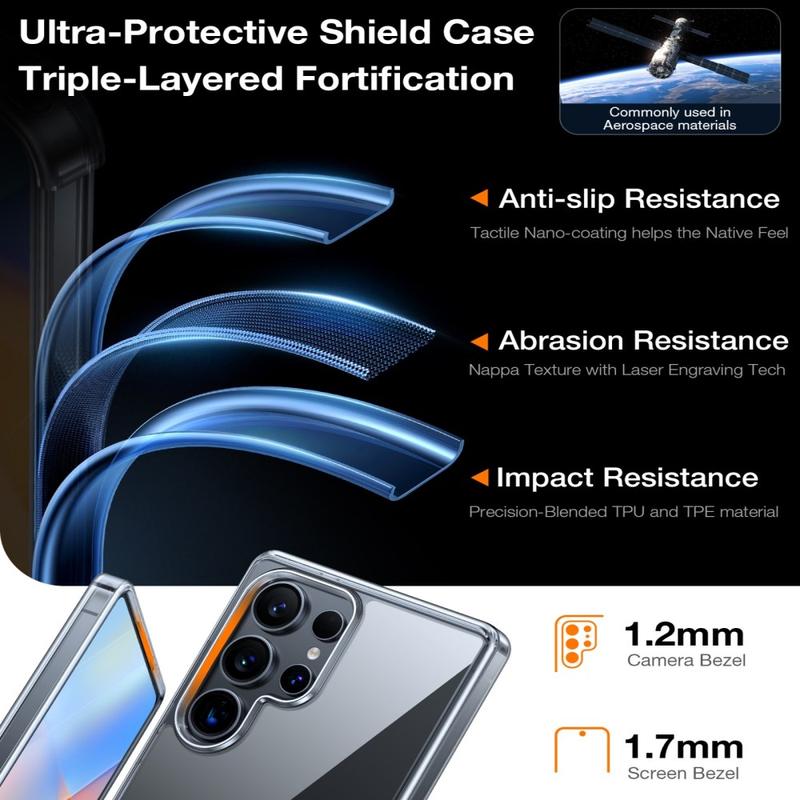 Dekselet har en innvendig støtdempende struktur og en forsterket TPU-støtfanger som bidrar til å redusere kraften ved utilsiktede fall og støt. Integrerte luftputesoner gir ekstra beskyttelse for daglig bruk uten å legge til unødvendig masse.