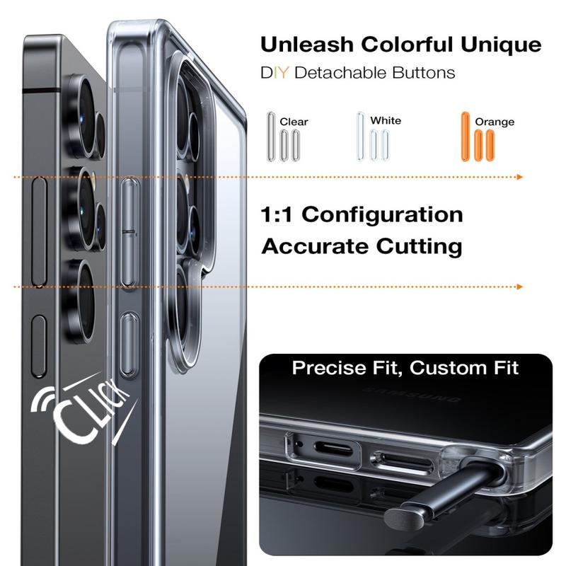 Dekselet inneholder tre utskiftbare knappesett i ulike farger, slik at du kan tilpasse utseendet til din Samsung Galaxy S26 Ultra. Du kan enkelt bytte ut knappene slik at de passer til stilen, antrekket eller humøret ditt, og skape et unikt, tilpasset utseende.