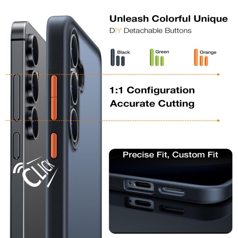 Dekselet inneholder tre utskiftbare knappesett i ulike farger, slik at du kan tilpasse utseendet til din Samsung Galaxy S26+. Du kan enkelt bytte ut knappene slik at de passer til stilen, antrekket eller humøret ditt, og skape et unikt, tilpasset utseende.