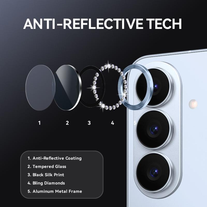 Gi Samsung Galaxy S26 glitter og beskyttelse med NORTHJO Camera Lens Protector. Den er designet med glitrende rhinestones og presisjonsslipt herdet glass, og beskytter kameralinsen mot riper, støv og støt, samtidig som den tilfører et snev av eleganse og luksus.