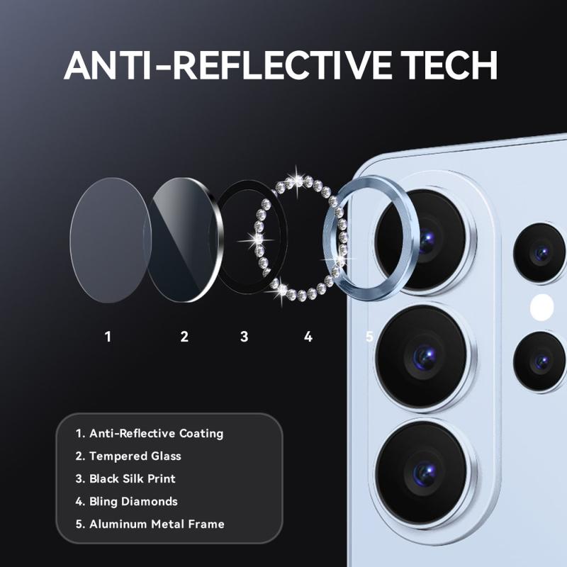 Gi Samsung Galaxy S26 Ultra glitter og beskyttelse med NORTHJO Camera Lens Protector. Den er designet med glitrende rhinestones og presisjonsslipt herdet glass, og beskytter kameralinsen mot riper, støv og støt, samtidig som den tilfører et snev av eleganse og luksus.