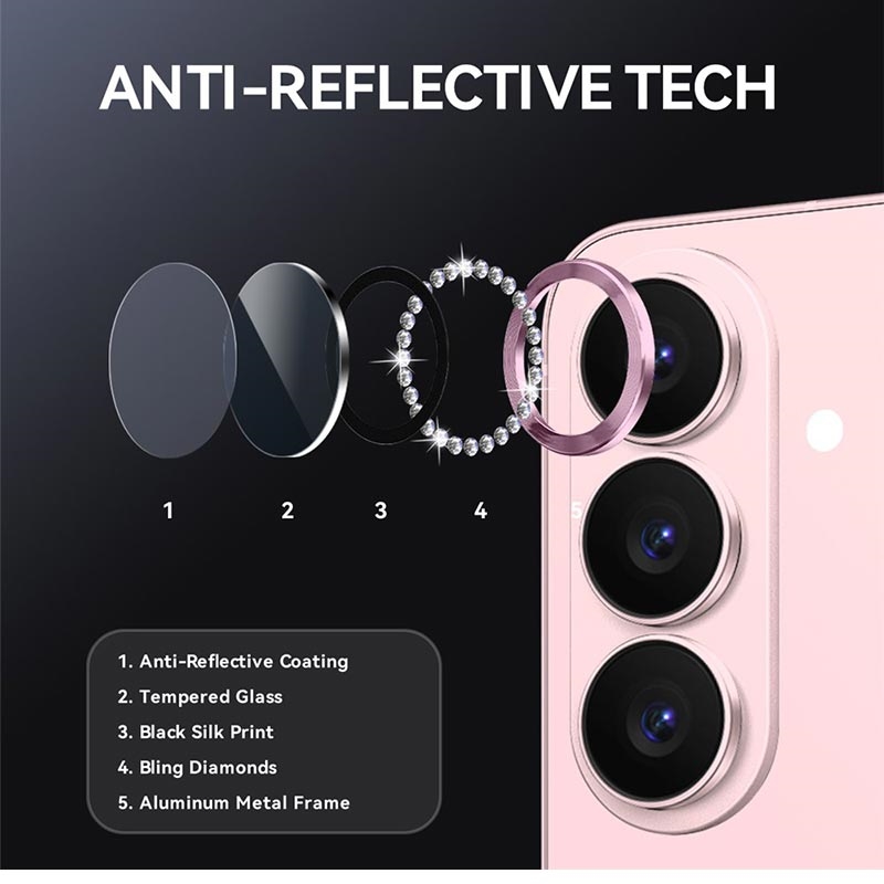 Gi Samsung Galaxy S26+ glitter og beskyttelse med NORTHJO Camera Lens Protector. Den er designet med glitrende rhinestones og presisjonsslipt herdet glass, og beskytter kameralinsen mot riper, støv og støt, samtidig som den tilfører et snev av eleganse og luksus.