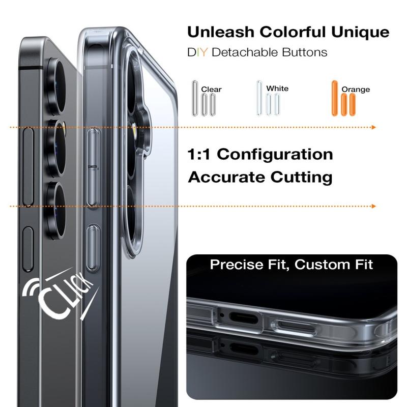Dekselet inneholder tre utskiftbare knappesett i ulike farger, slik at du kan tilpasse utseendet til din Samsung Galaxy S26+. Du kan enkelt bytte ut knappene slik at de passer til stilen, antrekket eller humøret ditt, og skape et unikt, tilpasset utseende.