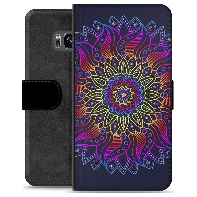 Samsung Galaxy S8+ Premium Lommebok-deksel med Fargerik Mandala-design kombinerer stil med funksjonalitet og sikkerhet for din enhet. Dette attraktive dekselet har en levende og fargerik mandala som er satt mot en mørk bakgrunn, noe som gir et unikt og iøynefallende look.