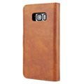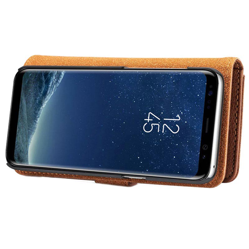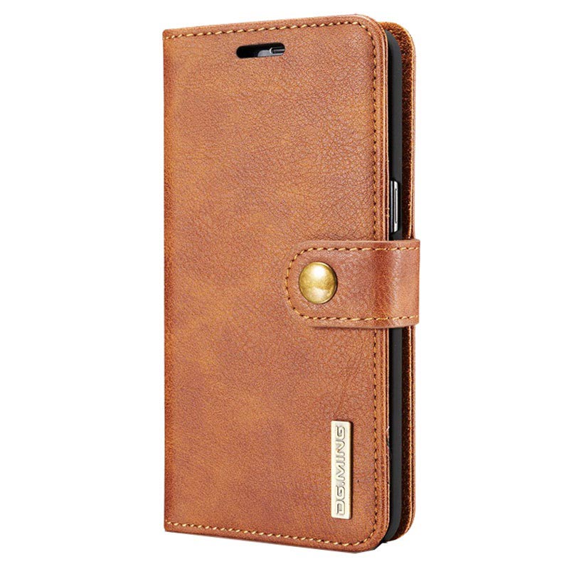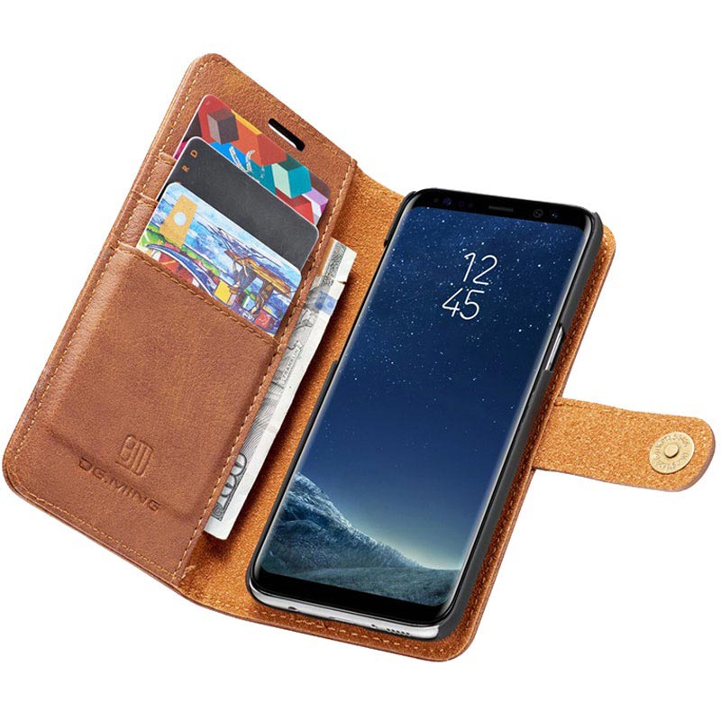 DG.Ming 2-i-1 lommebok-deksel til Samsung Galaxy S8 kombinerer en folio av limlær med et avtakbart, magnetisk deksel. Denne nydelige lommeboken kombinerer luker til kort og en lomme til oppbevaring av kontanter eller lignende, små tilbehør. En metall-lukking med en trykknapp legger til ekstra sikkerhet og gjør det mulig å bruke lommeboken som et stativ til en håndfri medievisning. Presise utskjæringer til høyttaleren lar deg snakke med lukket lommebok.