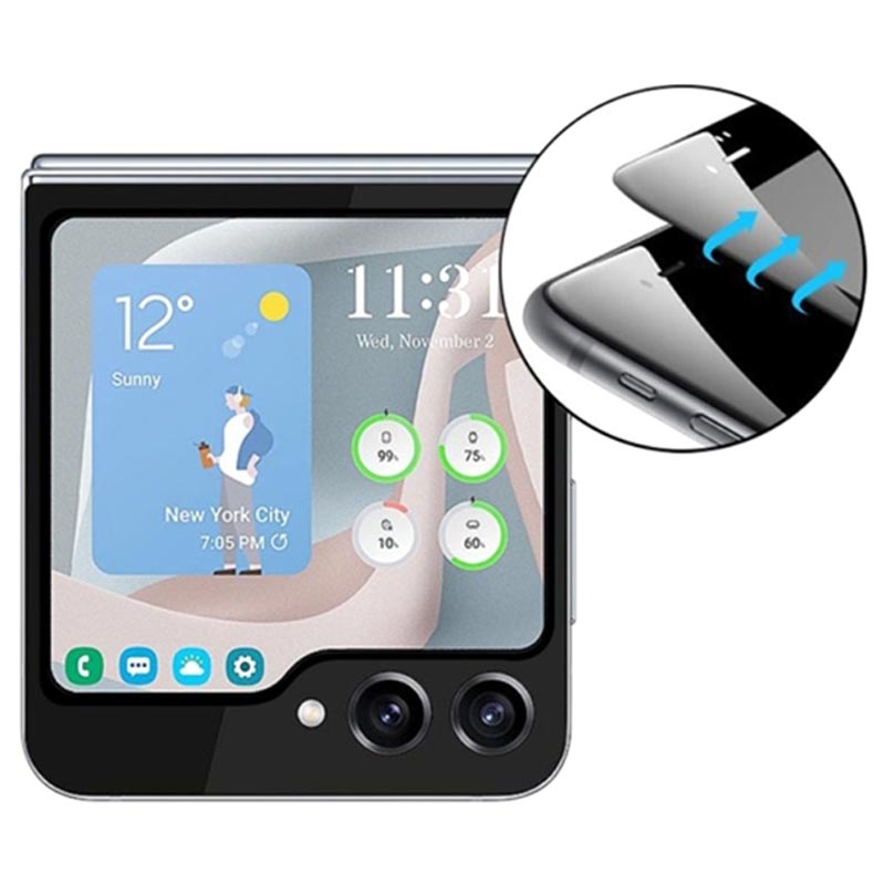 - Skjermbeskytter i herdet glass med full dekning til Samsung Galaxy Z Flip5 ytre skjerm