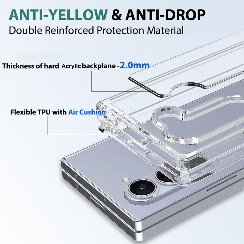 Dette tilbehøret bruker en kombinasjon av akryl og TPU for å holde smarttelefonen i best mulig stand. Samtidig ser forsterkede, støtabsorberende hjørner for å forhindre fallskader, mens den gjennomskinnelige designen viser den vakre utformingen av Samsung Galaxy Z Fold6.