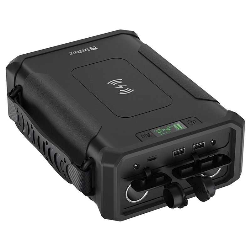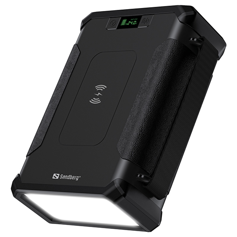 trådløs powerbank. Denne powerbanken har en enorm kapasitet på 96000mAh, som sikrer at du kan holde enhetene dine slått på i lengre perioder. Med flere ladeutganger kan du lade ulike enheter som bærbare datamaskiner, smartenheter, campingutstyr og til og med CPAP-maskiner. Sandberg powerbank kan også brukes som trådløs lader for å lade dine Qi-kompatible enheter. Dessuten kommer den med en digital skjerm, lett å bære håndtak og lommelykt, noe som er flott hvis du befinner deg i mørke omgivelser eller trenger et nødsignalverktøy.