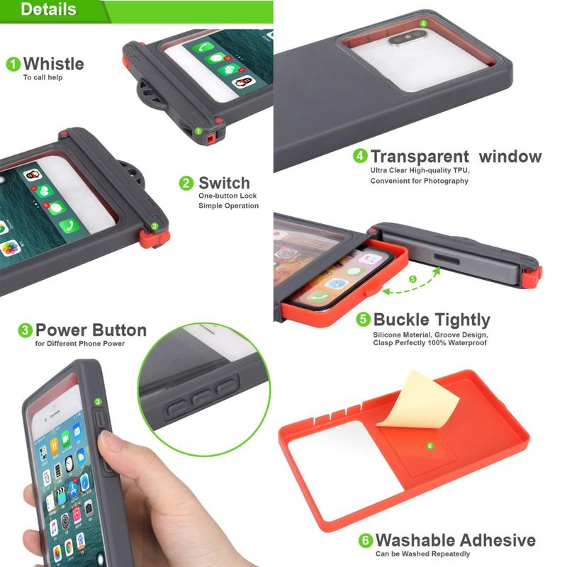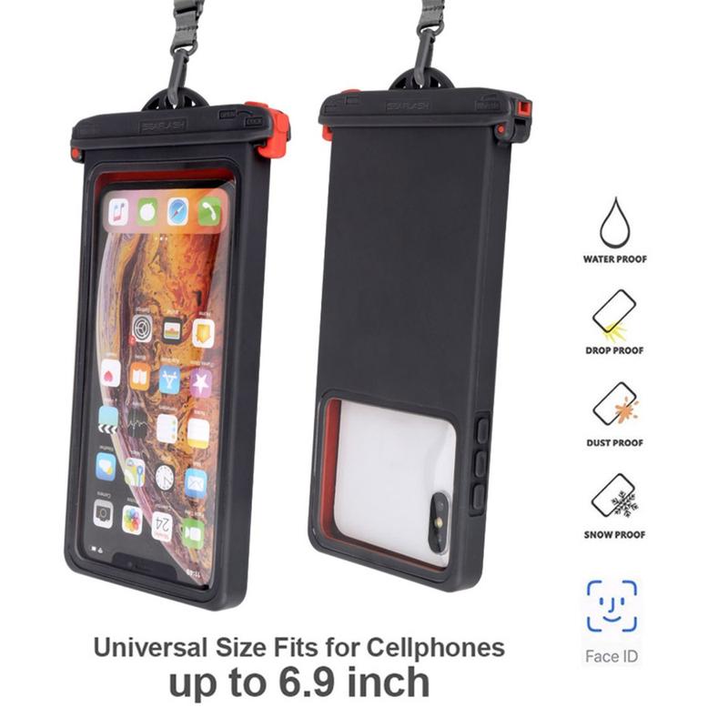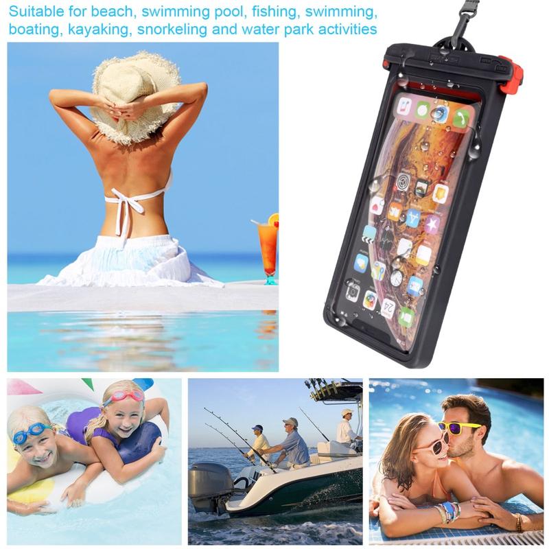 Ekstern dimensjon: 18,5 * 9m * 1,3cm, intern dimensjon: 17 * 8,5 * 0,9cm, egnet for de fleste smarttelefoner opp til 6,9 tommer. Denne vanntette tørrposen er egnet for strand, svømmebasseng, fiske, svømming, båtliv, kajakkpadling, snorkling og vannparkaktiviteter