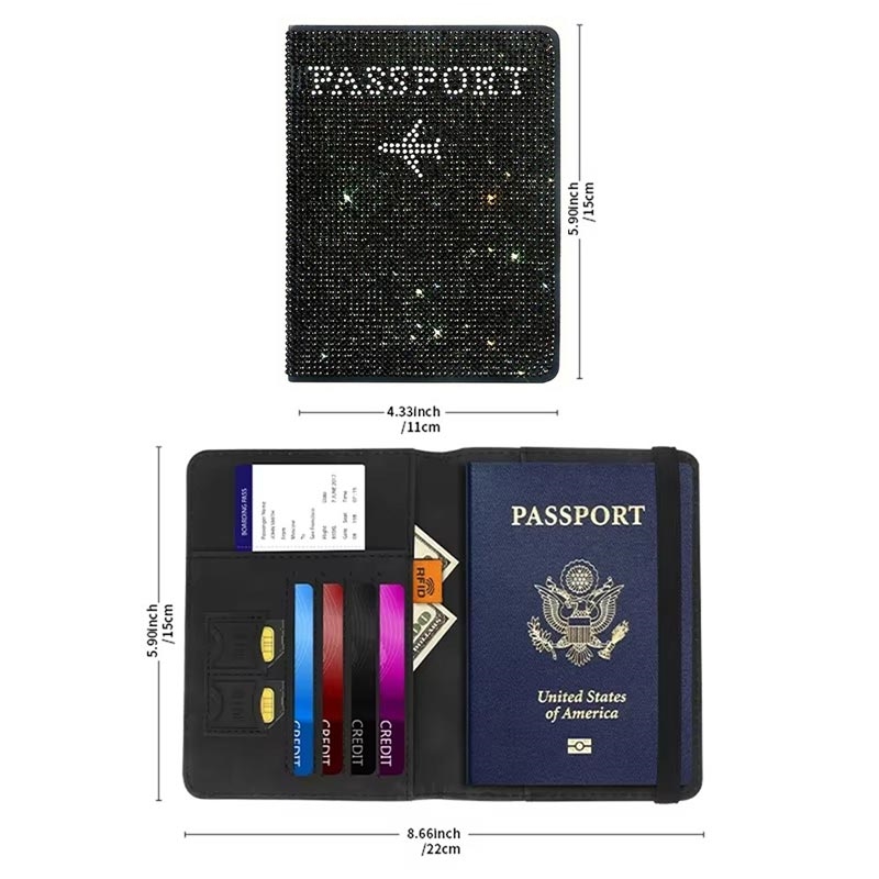 Reis med stil med settet med passholder og bagasjelapp i rhinestone, en glamorøs tilbehørsduo designet for eleganse og praktisk bruk. Dette matchende settet er laget av slitesterk polyuretan og prydet med blendende rhinestones, og bringer luksus og glitter til enhver reise.