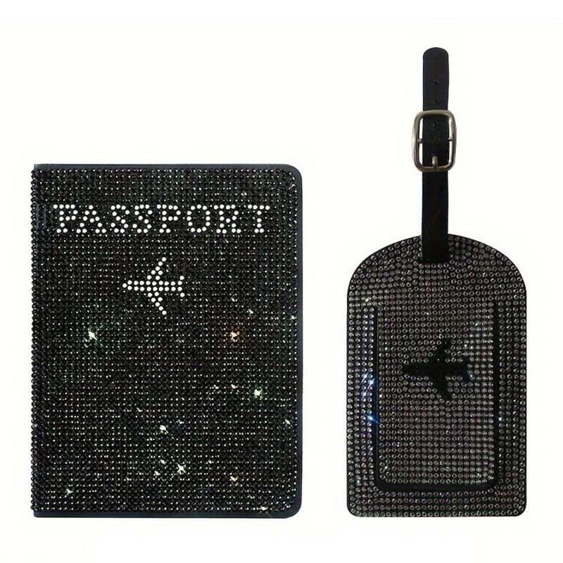 Sett med passholder og bagasjelapp med rhinsteiner - glitrende reiseorganisator i polyuretan