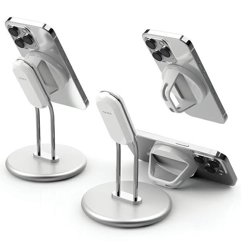 SODI SIM300 Magnetic Phone Stand har en unik design inspirert av arkitektonisk estetikk, og tilbyr både funksjonalitet og stil. Stativet er laget av en aluminiumslegering av høy kvalitet og myke silikonputer, og gir en stabil og ripefri støtte for telefonen din. Stativets magnetiske holder er avtakbar, slik at den kan brukes separat eller erstattes med en trådløs iPhone MagSafe-lader (ikke inkludert).
