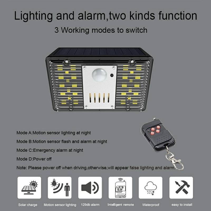 Solcelledrevet utendørs LED-lys med sikkerhetsalarm N775 - 129 dB utendørs sikkerhets- og hagelampe, 4 lysmoduser, IP55 vanntett