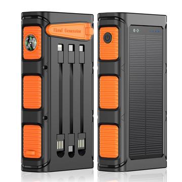 20000mAh solcelledrevet powerbank med håndsveiv, PD 20 W hurtiglading, LED-lommelykt og innebygde kabler