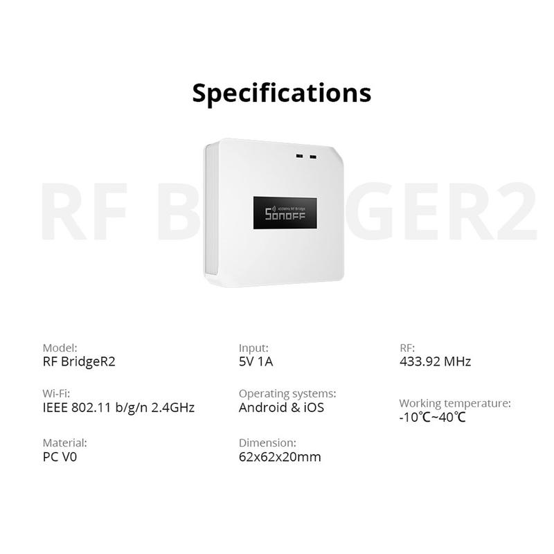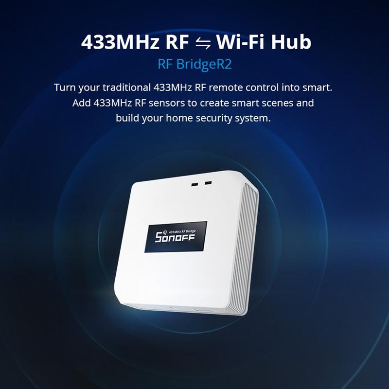 Ta med dine 433MHz RF-enheter inn i ditt WiFi-smarte hjem med Sonoff RF BridgeR2. Denne kompakte smarte huben fungerer som en bro mellom RF 433,92 MHz-sensorer og fjernkontroller og ditt WiFi-nettverk, slik at du kan administrere kompatible enheter fra telefonen din via eWeLink-appen. Bruk den til å forenkle kontrollen av flere RF-enheter, opprette automatiseringsscener og motta varsler om sikkerhetshendelser som døråpninger eller bevegelsesdeteksjon.