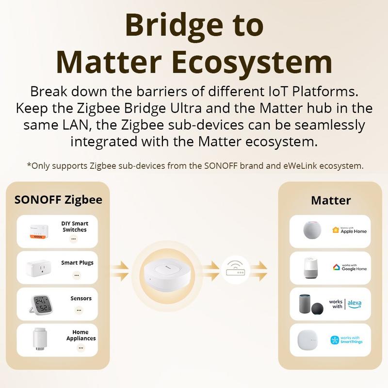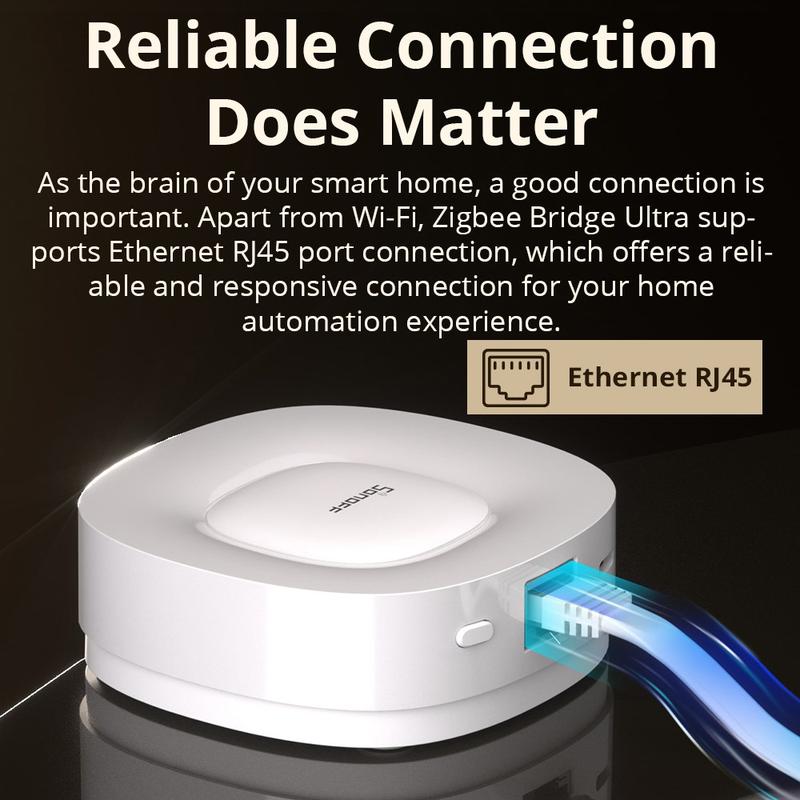 Samle ditt smarte hjem-økosystem med Sonoff ZBBridge-U Zigbee Bridge Ultra. Denne avanserte gatewayen kobler Zigbee 3.0-enheter til WiFi-nettverket ditt og støtter Matter bridge-funksjonalitet, slik at kompatible Zigbee-enheter kan integreres sømløst på tvers av forskjellige smarte hjem-plattformer. Med både WiFi og kablet Ethernet-alternativer leverer den fleksibel og stabil tilkobling for pålitelig automatisering, sikkerhet og stemmekontroll.