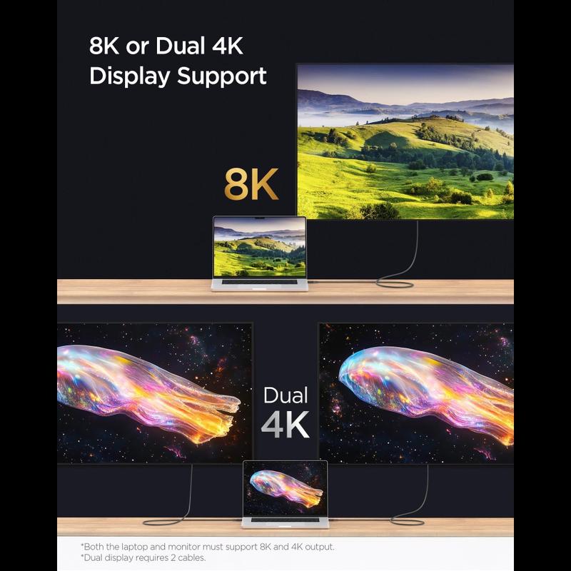Takket være kompatibilitet med Thunderbolt 3 og 4 støtter kabelen også avansert videoutgang - 8K (enkeltskjerm) og 4K (dobbeltskjermer) via DisplayPort 2.0. Dette gjør den perfekt for tilkobling av bærbare datamaskiner eller dokkingstasjoner til skjermer med høy oppløsning.