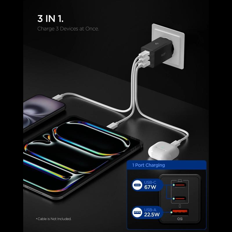 Spigen Essential EE673EU 3-port vegglader - 67W GaN Pro hurtiglader med dobbel USB-C og USB-A