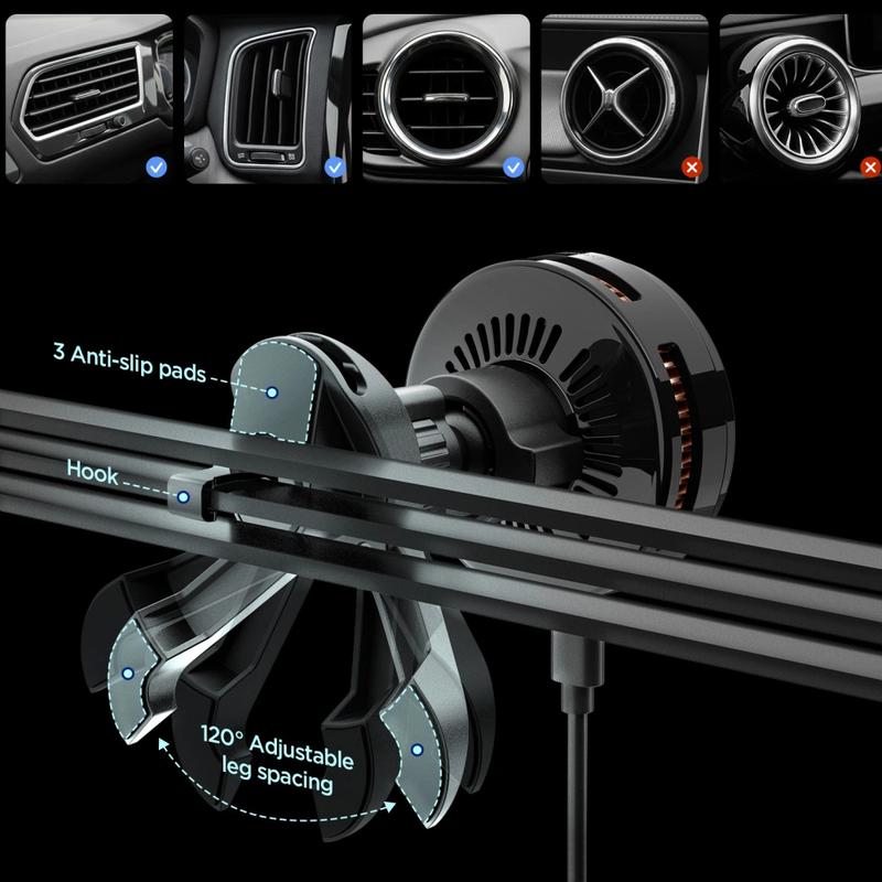 Spigen Essential EV25MFAQ Qi2.2 Peltier magnetisk MagSafe luftventil bilholder / 25 W trådløs lader med aktiv kjøling