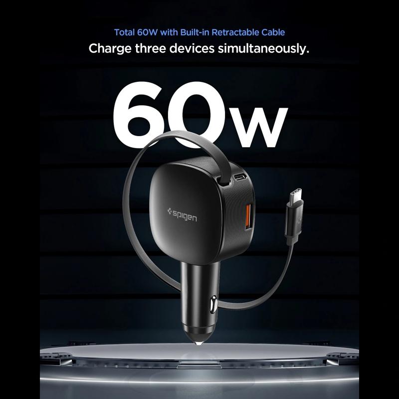 Spigen EV603BT Essential bilopplader – 60 W hurtiglading med uttrekkbar USB-C-kabel og USB-C- og USB-A-porter