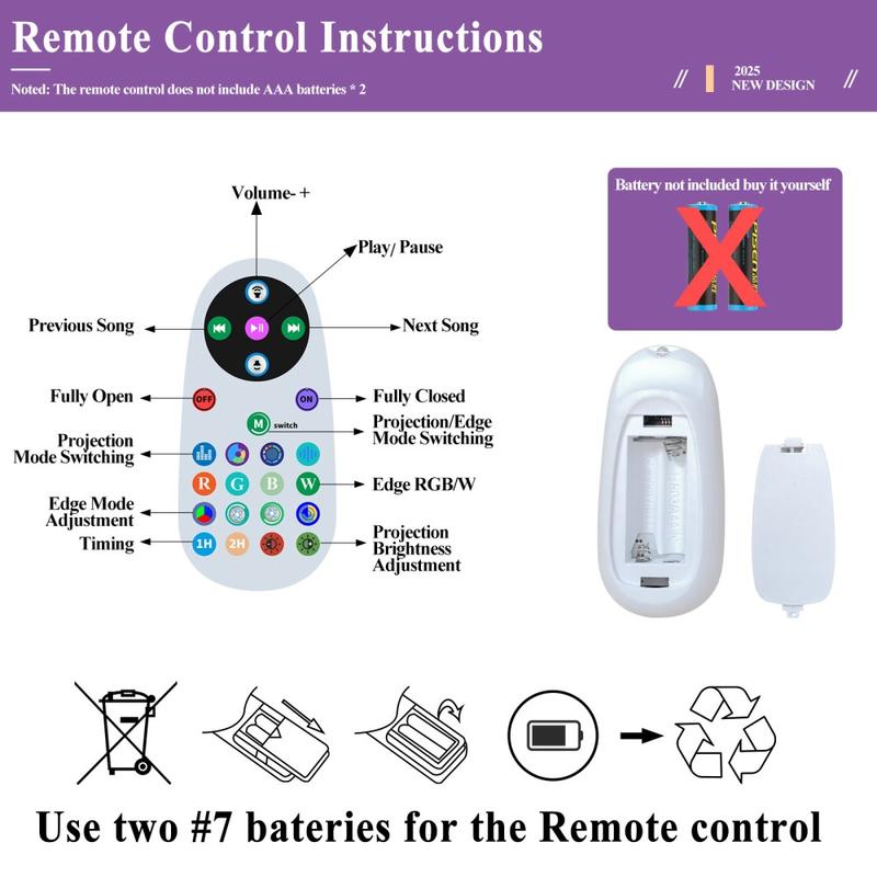 - Uavhengig lysstyring - juster lysstyrken på projeksjonen, bytt RGB-ring og still inn 1 t / 2 t automatisk av-timer.