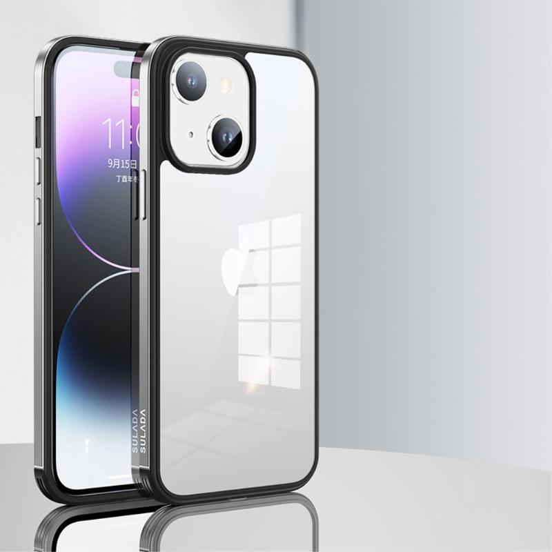 SULADA Minrui-serien for iPhone 14 Plus ryggbeskytterdeksel, galvanisering av metallramme Høy gjennomsiktig TPU + telefonskall i herdet glass