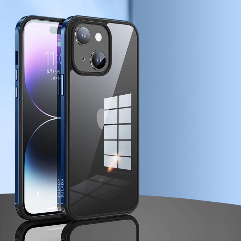 SULADA Minrui-serien for iPhone 14 Plus ryggbeskytterdeksel, galvanisering av metallramme Høy gjennomsiktig TPU + telefonskall i herdet glass