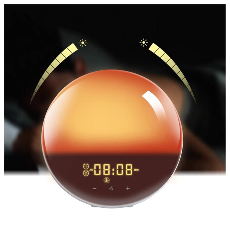 Fire sett med vekkerklokker: simulert soloppgang, naturlig vekking av lys, 9 innebygde ringetoner og FM-radiokanal kan også velges som alarm. Det er tre vekkemoduser, 5 slumrer