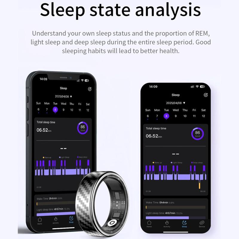 Sett avansert helseteknologi på fingeren din. SY02 Smart Ring kombinerer et elegant karbonfibermønster med sensorer av medisinsk kvalitet som registrerer oksygenmetning i blodet (SpO2), kontinuerlig pulsutvikling og søvnstadier - 24 timer i døgnet, til og med under vann. Et ladeetui i lommeformat gir hele fem dagers normal bruk med én times lading, og med smarte bevegelseskontroller kan du bla gjennom sosiale medier eller ta bilder uten å berøre telefonen. Lett rustfritt stål (≈ 4 g / 0,004 kg) og et gel-fylt indre gjør den komfortabel nok til at du glemmer at du har den på deg - men samtidig kraftig nok til å holde deg informert, motivert og tilkoblet.
