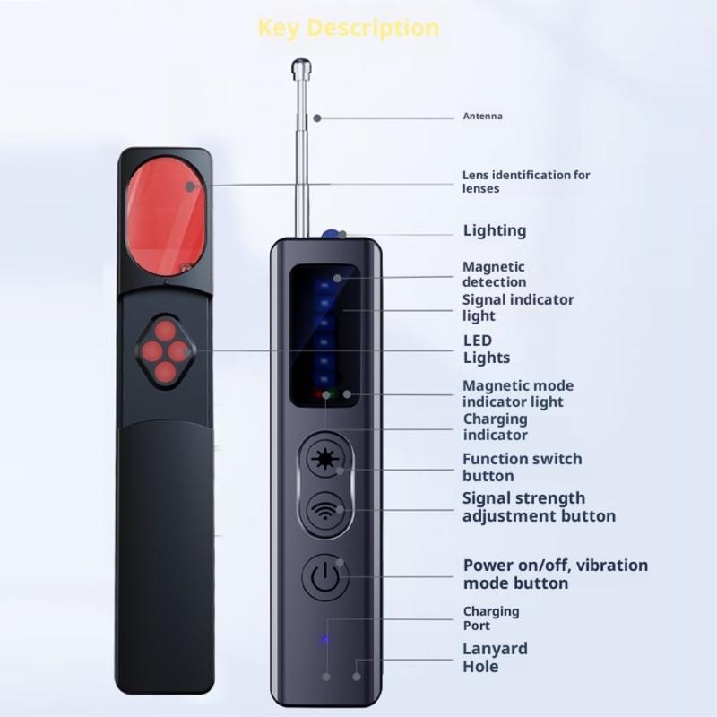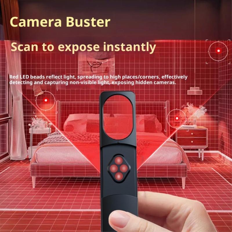Den innebygde infrarøde LED-skanneren avslører skjulte kameralinser, selv om de er slått av eller i skjult modus - ideelt for å oppdage hullkameraer i speil, røykvarslere, luftventiler, klokker og andre gjenstander.