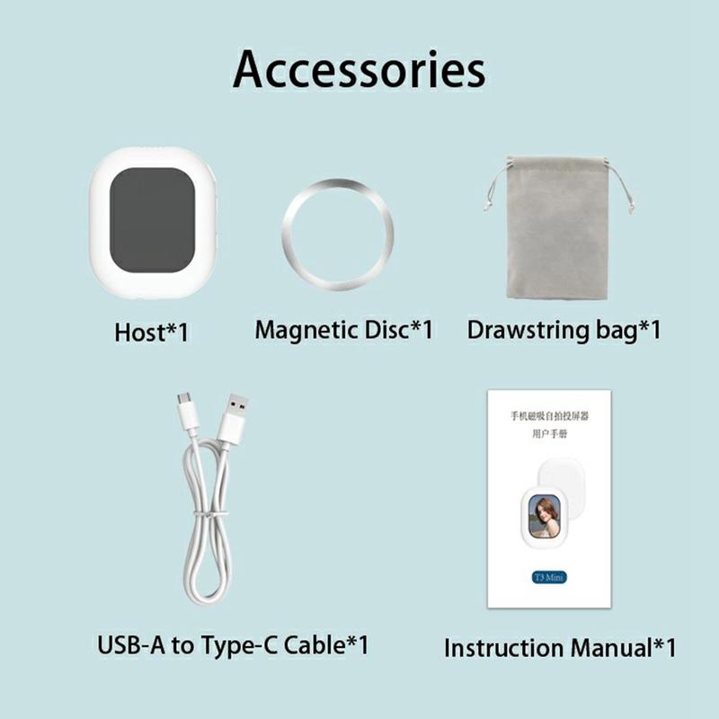 T3 Mini er en trådløs skjermspeilingsenhet for mobiltelefoner - et kompakt og praktisk tilbehør som er utviklet for å gjøre det enklere å ta selfies, lage vlogger, produsere innhold og ta bilder med bakkameraet. Med øyeblikkelig magnetisk festing, trådløs skjermspegling og en lys 2,01-tommers IPS-skjerm hjelper den deg med å forhåndsvise bakkameraet på telefonen din i sanntid uten komplisert oppsett. Den lette designen gjør den enkel å ta med seg hvor som helst, noe som gjør den til et nyttig verktøy for hverdagsbilder, korte videoer, livestreaming og reiseinnhold.